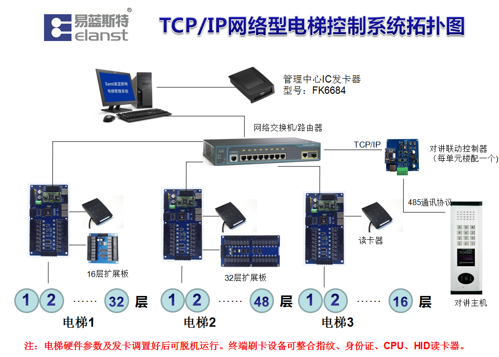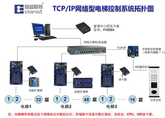 2、Elanst电梯刷卡按通讯方式分类:RS458联网型电梯控制系统、TCP/IP联网型电梯控制系统、脱机IC免布线式电梯管理系统。