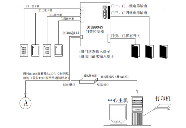 一个RS485网络通讯口,网络总长可达1200米 ,单条总线可连接127个门禁控制器