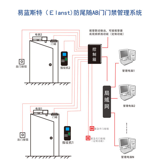 根据以上要求,我们推荐使用ELANST非接触式IC门禁系统和世界上最先进的BIO指纹仪,本系统相对于以往传统的接触式系统,具有更多的优点。通过这套系统,可以实现对人员权限的明确限定,控制器采用先进高集成的CPLD设计技术,可完成密码与卡号的识别、信息查询、在线控制、参数设置、异常情况的自动报警等远程自动化管理。感应卡采用MF1卡,卡号永不重复,实行每卡一个密码,保密性强并可挂失。BIO指纹仪采用活体硅感识别,算法先进,验证速度快小于1秒。在全球指纹大赛FVC2002、FVC2004连续两届第一名。操作程序采用卡+密码,双重核对,除需进行刷卡核对IC卡号外,还需核对人工密码方能开门。此外,系统还具有胁迫密码开门方式,即:当工作人员受到歹徒胁迫时,可通过输入胁迫密码将门打开,与此同时,系统会自动发出报警信号,该报警信号可接入110系统或银行内部报警系统。