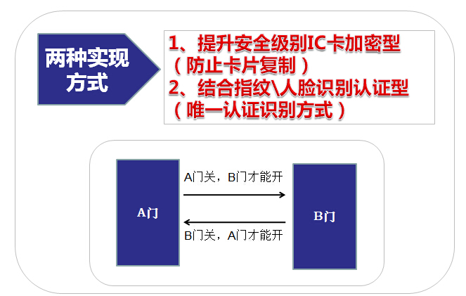 1、双门互锁功能    当任一门受控需开启时,绝对禁止另一扇门处于开启状态,具有自动防尾随跟入功能。对特殊场所,还可以实现3道门以上的门多门互锁。