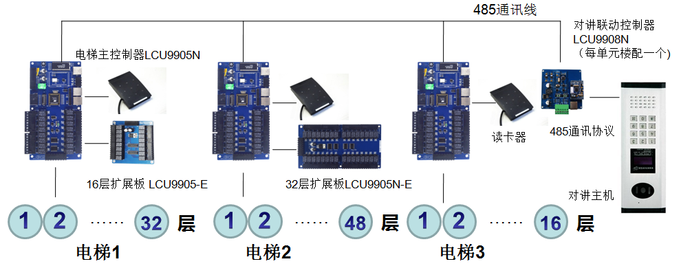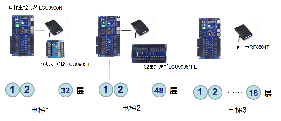 一块主控板可控制16个楼层;增加1块楼层扩展板,可增加控制32-48个楼层;